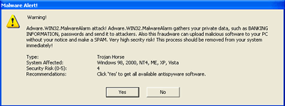 Adware.Win32.MalwareAlarm is a Trojan name that appears on fake warning messages which are used to threaten and trick users into buying rogue anti-spyware applications. Adware.Win32.MalwareAlarm warning message may appear after a drive-by download or after downloading a video codec bundled with a nasty Trojan, popularly known as Zlob. Zlob Trojan then displays false warning messages stating "Adware.WIN32.MalwareAlarm attack!" and recommends to download an antispyware program to allegedly remove the Adware.WIN32.MalwareAlarm infection. However, the anti-spyware program recommended will not fix your computer but may actually expose you to more security threats.