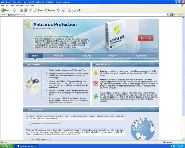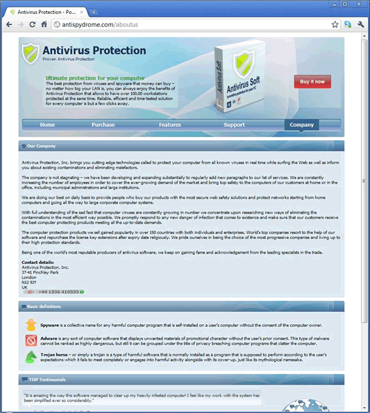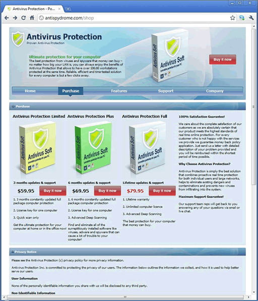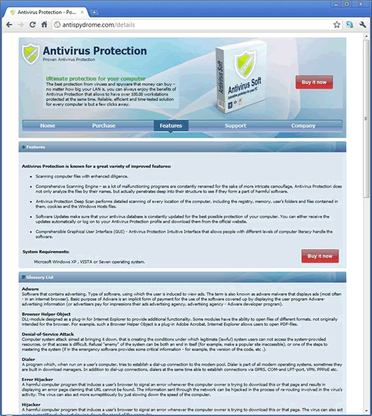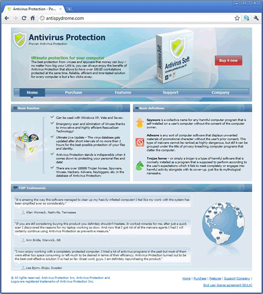 Antispydrome.com is only one of a large group of websites working together to pull a fast one on PC users by selling Antivirus Protection (also known as Antivirus Protection Trial), a nonfunctional and rogue anti-virus program. Related websites include but aren't limited to Antivirvip.net, Antivirvip.com, Antivirea.com and Antivirart.com. Even Antivirus Protection is marketed under many different names, with AntiVira AV being one of its most prominent clones.