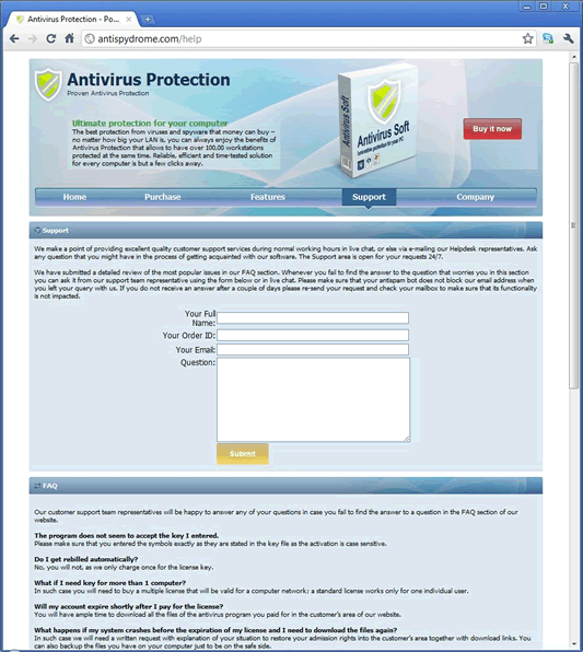 Antispydrome.com is yet another malicious website pretending to be a legitimate domain for security software. Like many other harmful sites, Antispydrome.com promotes Antivirus Protection, a rogue security program that attacks your PC security and browser use while trying to scam a quick buck through an activation process. Contact with Antispydrome.com or any of the many other harmful websites identical to Antispydrome.com can result in infection by Trojans or other malware threats due to attacks that exploit browser security flaws. Although deleting Antispydrome.com-related software is critical for maintaining a healthy computer, you should preferably do this with the help of anti-malware applications that are designed to remove Antivirus Protection and other complex threats.