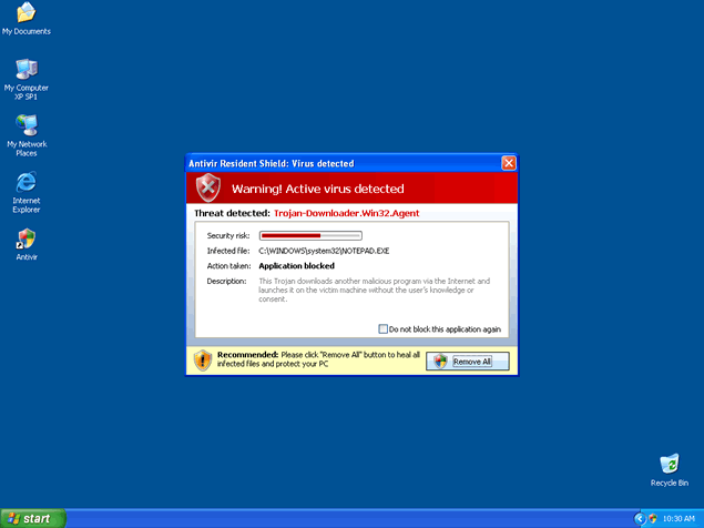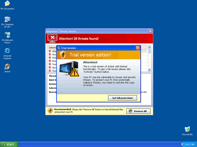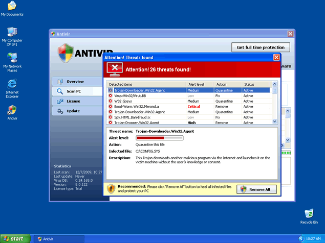 Antivir may use the name of a line of popular anti-virus products, but, unlike real AV applications, Antivir doesn't have any of the security features that Antivir advertises. Rogue AV programs that piggyback off of the Avira brand have been known since at least 2010, and Antivir (along with its offshoot, Antivir 2010) is still being distributed as of 2012. Contact with Antivir may be precipitated by fake online scanners, Zlob Trojans that disguise themselves as updates for media players or drive-by-downloads from associated websites. Antivir's primary symptom is the usage of a range of inaccurate warning messages that are used to make it appear as though multiple types of PC threats are assaulting your computer. Samples of some of Antivir's alerts include the following: