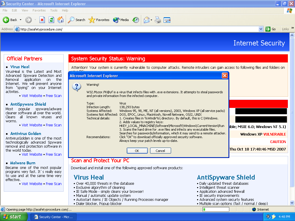Asafetyprocedure.com is a browser hijacker that is designed to hijack your Internet Explorer homepage and redirect it to http://www.asafetyprocedure.com. Asafetyprocedure.com usually comes bundled with Zlob Trojan. This hijacker generates fake alerts about Myzor@fk or Trojan-spy.win32@mx infections detected on your machine. Asafetyprocedure.com advertises and distributes rogue anti-spywares, such as AntiSpyGolden, AntiVirGear, VirusHeal.