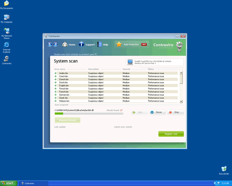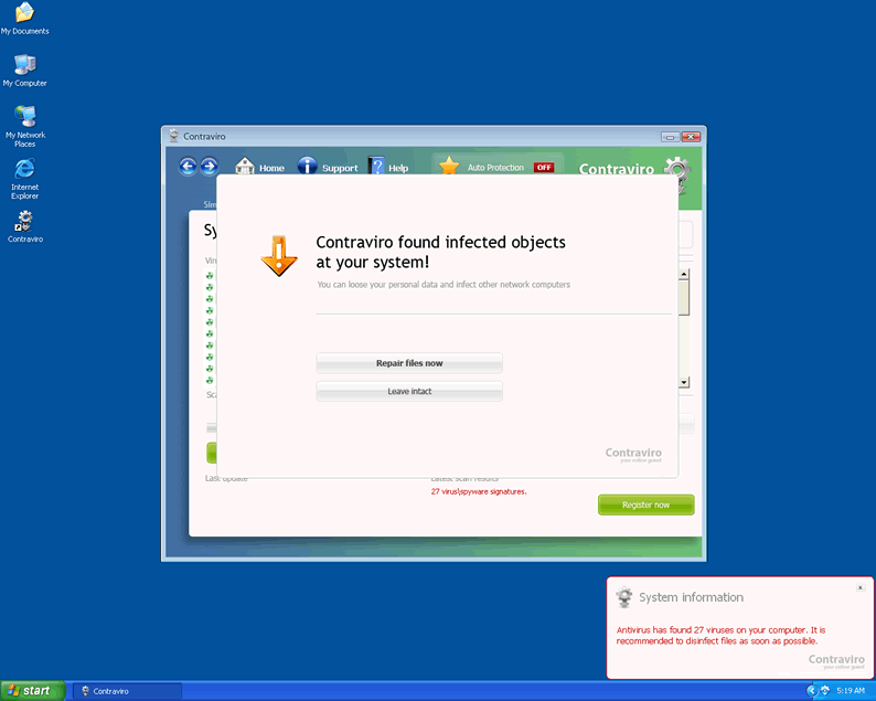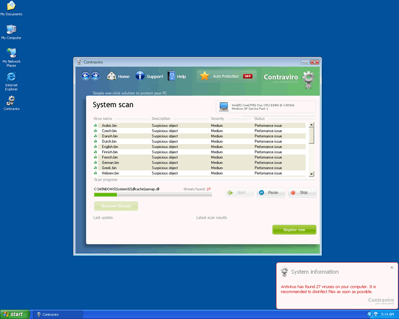 Contraviro is a fake spyware remover and a clone of the rogue spyware remover Unvirex. Using scare tactics to intimidate you into purchasing the full version of Contraviro, these include such things as fake system scans that display numerous fabricated infection results, along with non-stop and annoying pop-up ads and false security alerts. However, what is important to note, is that the threats listed by Contraviro are typically legitimate programs, and if you were to delete them, you would be causing serious damage to your Windows system. All of this is used in order to persuade you to purchase the full version of Contraviro, thus wasting your precious money.