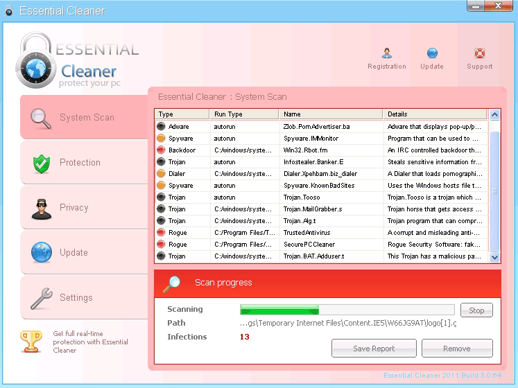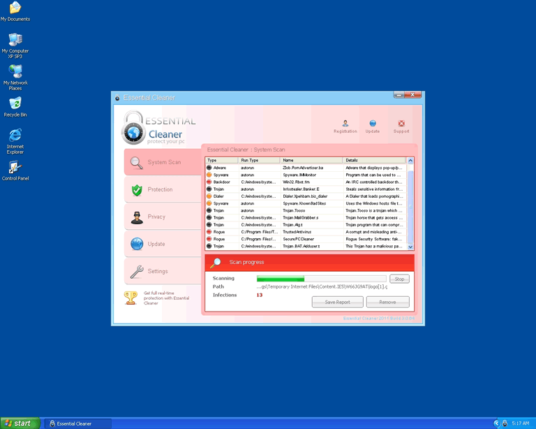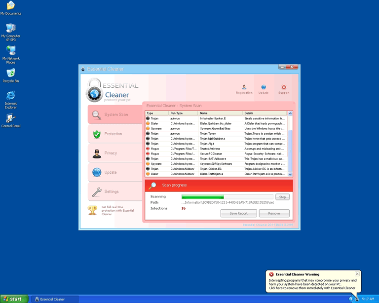 Essential Cleaner pretends to be a software solution to malware infections, but it never really takes the time to scan your computer. Instead, Essential Cleaner creates fake warnings like the samples below without checking to see if the infections are there or not: