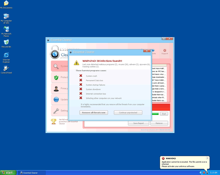 You can also be infected by Essential Cleaner clones, which show the same properties with different program names. Some major Essential Cleaner clones include System Tool, Live Security Platinum, System Tool 2011 and System Tool 2.20.