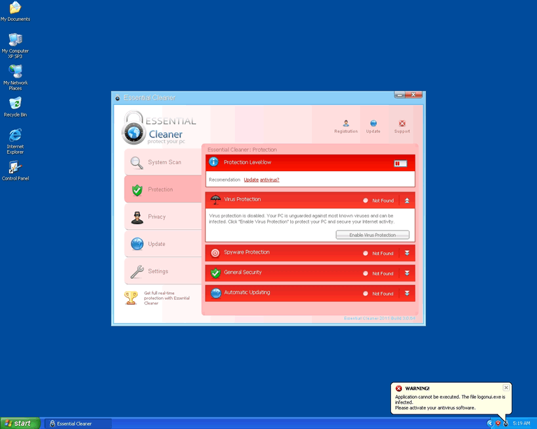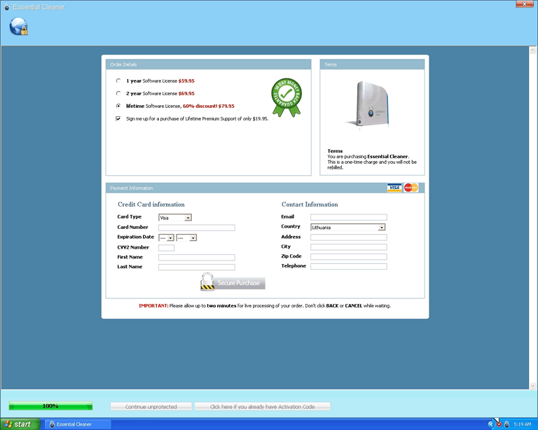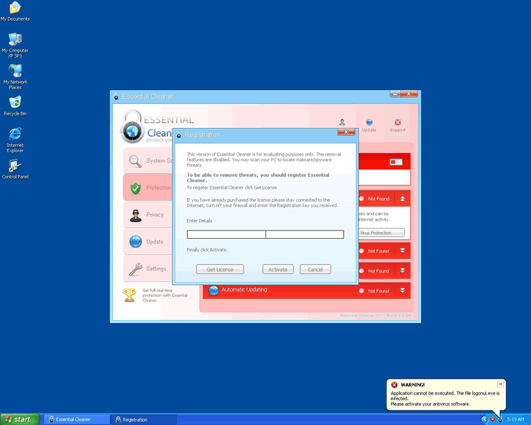 Since Essential Cleaner doesn't offer any real anti-virus protection, there's no reason for you to purchase it as Essential Cleaner so insistently recommends. Other problems linked to Essential Cleaner include: