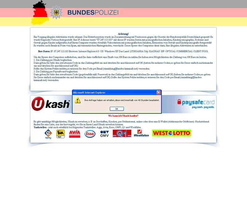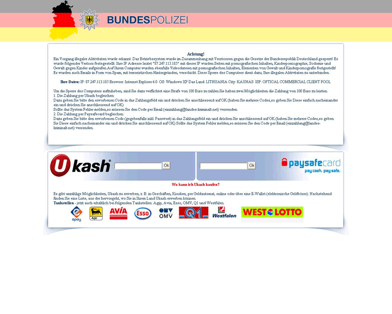 This lengthy warning will continue on to accuse you of downloading illegal materials such as child pornography. Fake Federal German Police (BKA) notice variante goes on to threaten you with legal action, but also leaves you a way out: just pay a not-so-small 100 Euro fine and all will be well again.