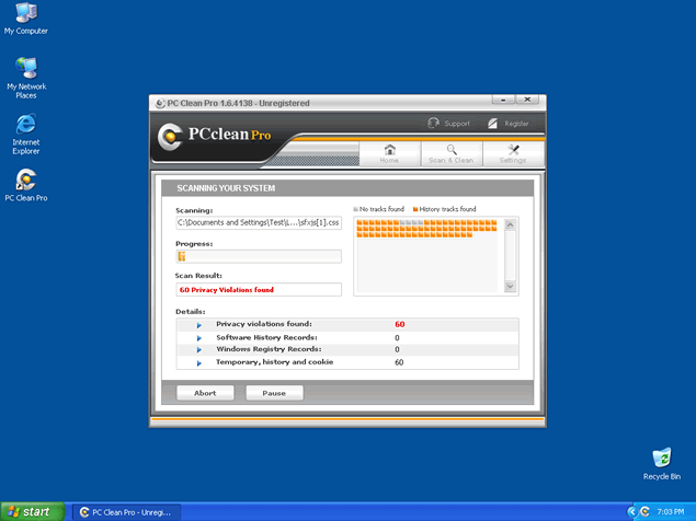 PC Clean Pro is a fake file-cleaning utility that pretends to scan your computer for compromising types of private material (such as web browser history) and then delete it once you purchase PC Clean Pro's full version. Even though PC Clean Pro is of minimal concern by itself, SpywareRemove.com malware experts have found that most PC Clean Pro infections are caused by other computer threats, I.e. Trojan droppers, that may also be present. Cautionary alerts from PC Clean Pro will usually take the form of warnings about your privacy, but PC Clean Pro isn't able to delete incriminating or unwanted files and only serves malicious purposes by being on your computer. Therefore, there's little reason to avoid deleting PC Clean Pro with your anti-malware scanner of choice as soon as you notice its existence, as displayed by its prominent pop-ups.