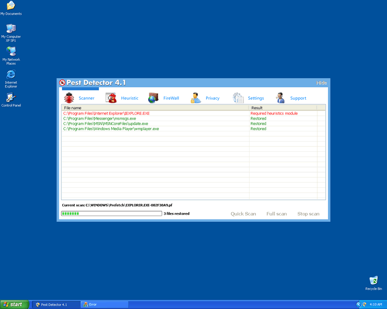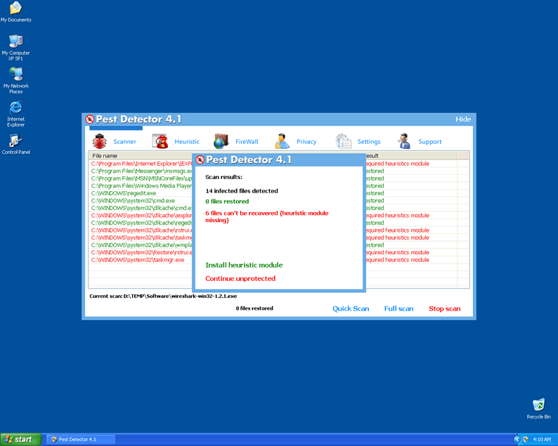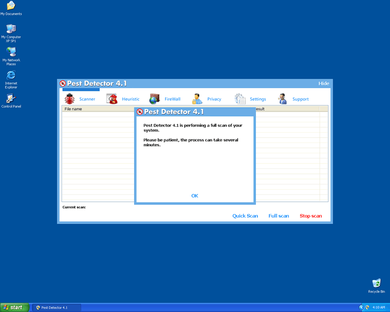Pest Detector 4.1 is a rogue security application created to pilfer money out of its victims. Pest Detector 4.1 uses scare tactics to convince a victim that his/her machine is infected with malware and the only solution is to purchase its "full version". Pest Detector 4.1 is a useless application that can neither detect nor remove malware therefore victims should remove this rogueware from their systems upon detection.