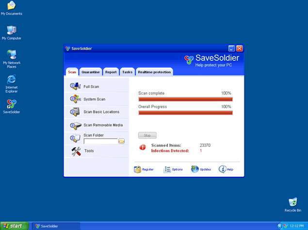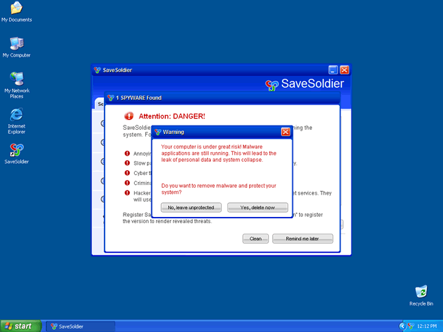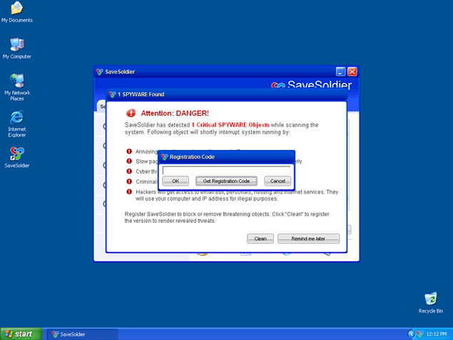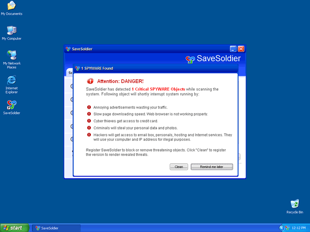 Save Soldier is a fake spyware remover promoted through the use of Trojans and fake online anti-malware scanners. Once installed, Save Soldier generates fictitious and sometimes grossly exaggerated scan results along with fabricated security alerts, all in order to fool you into thinking your PC is infected. You are then prompted to purchase and download the full version of Save Soldier to combat these imaginary threats.