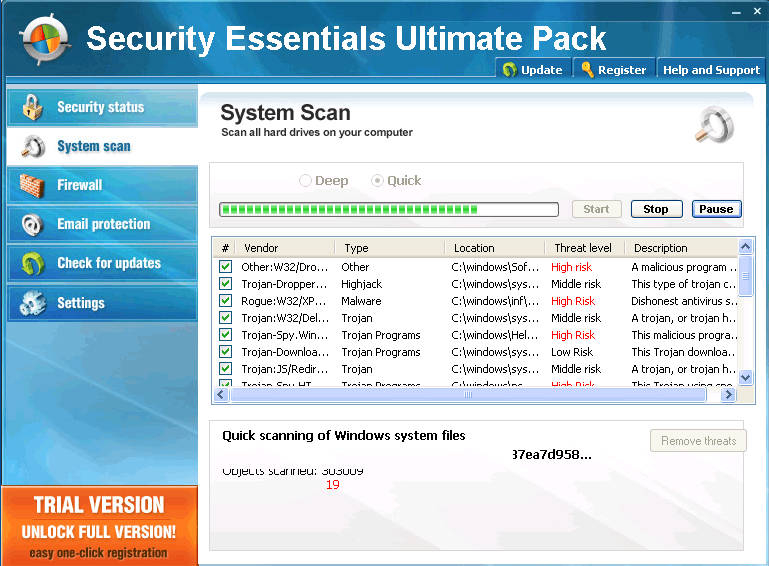 Any attempts to scan your PC with Security Essentials Ultimate Pack will show you results that are crammed full of more fake infections. Despite Security Essentials Ultimate Pack's pretenses of holding the keys to your computer's safekeeping, any security problems you might experience are likely to be related to Security Essentials Ultimate Pack itself.