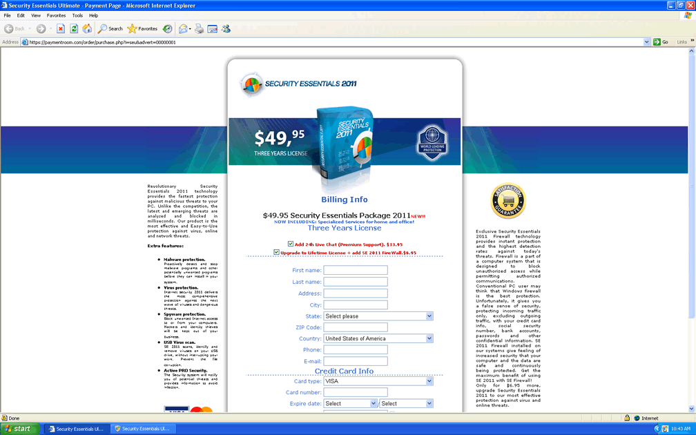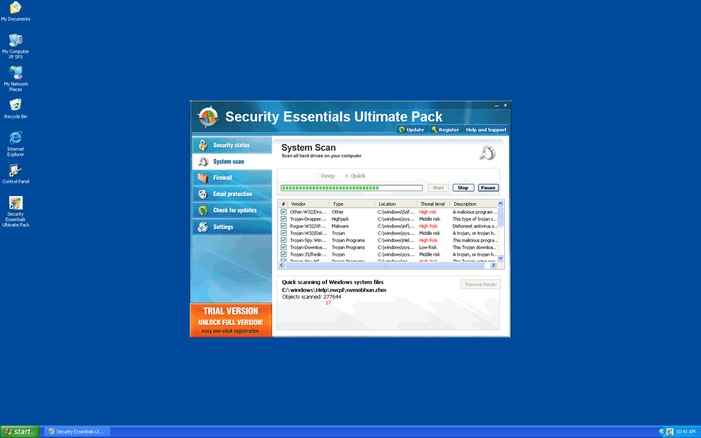 Security Essentials Ultimate Pack is identical to other rogue security programs in the Security Essentials group, including Security Essentials itself as well as Security Essentials 2011, Internet Security, Internet Security 2011 and Internet Security 2010. Security Essentials Ultimate Pack, like Security Essentials Ultimate Pack's clones, claims to provide a firewall, email protection, system scans and other security features that, in reality, Security Essentials Ultimate Pack doesn't have.