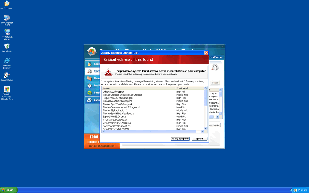 Instead of detecting real PC threats, Security Essentials Ultimate Pack uses fake warnings about nonexistent threats to make itself appear beneficial, before requesting that you spend money on Security Essentials Ultimate Pack. Some fake errors that are used by Security Essentials Ultimate Pack include: