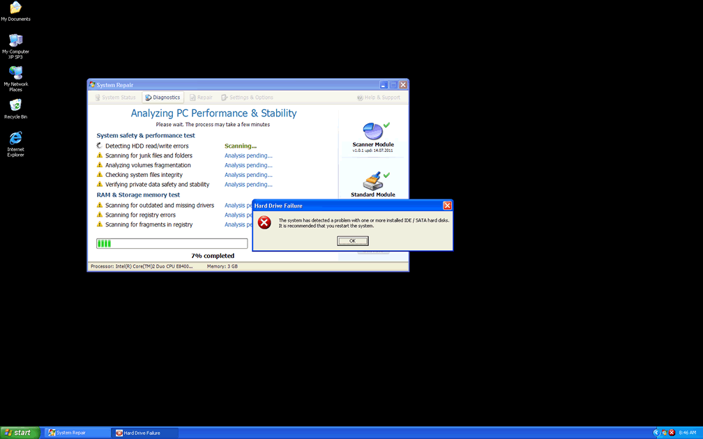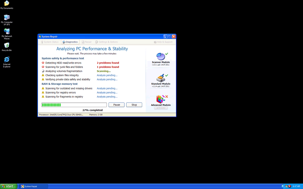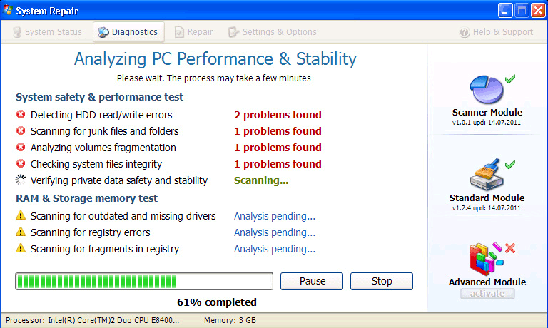 Most rogue security programs like System Repair are distributed by Trojans such as Zlob and Fake Microsoft Security Essentials Alert, although System Repair may also be downloaded from misleading websites. Relatives of System Repair use a similar interface and recycle the same attacks despite having different names - examples include Windows Diagnostic, Smart Defragmenter, FakeHDD, Windows Tool and WinScan. While pretending to scan your PC (in reality, System Repair has no such function), System Repair will also pretend to find countless wrong things in your computer.