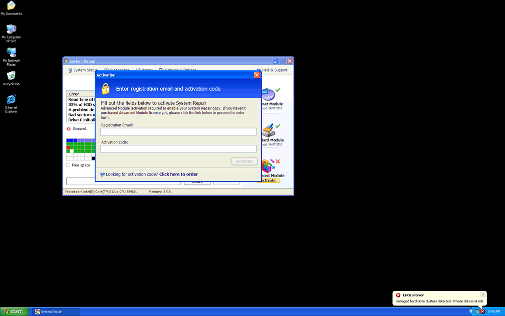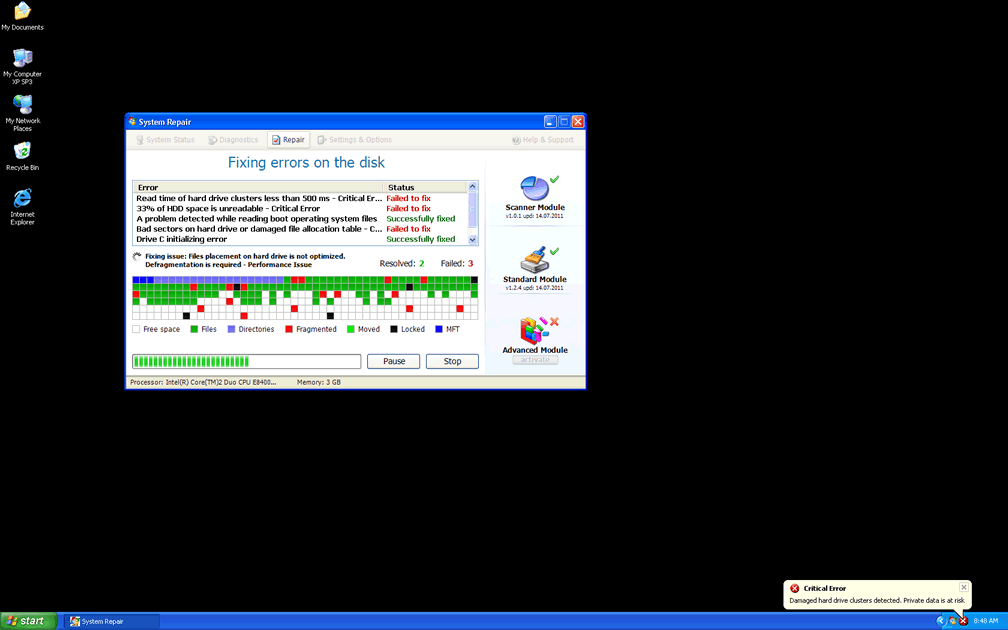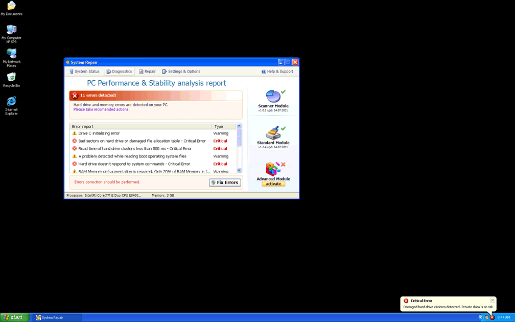 | 3 | Critical Error! Damaged hard drive clusters detected. Private data is at risk. |