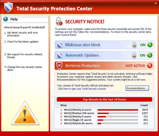 Protection Center reports that 'Total Security' is not activated. Antivirus software helps to prevent your computer against viruses and other security threats. Click Recommendations for the suggested actions. Your system migth [sic] be at risk now.