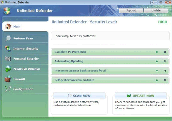 Unlimited Defender is a newborn addition to a fresh cartel of rogue anti-virus programs. Unlimited Defender's website and its own interface try to convince you that Unlimited Defender is capable of finding and removing spyware and other malware infections, but Unlimited Defender, like all rogue products, is only faking these features. The presence of Unlimited Defender has been linked with fake infection warnings, repetitive requests for money and fraudulent credit card charges. SpywaRemove.com researchers recommend that you use a good anti-malware product to clean Unlimited Defender from your PC, since Unlimited Defender may work in collusion with trojans and will make advanced changes to your system that should be reverted with care.