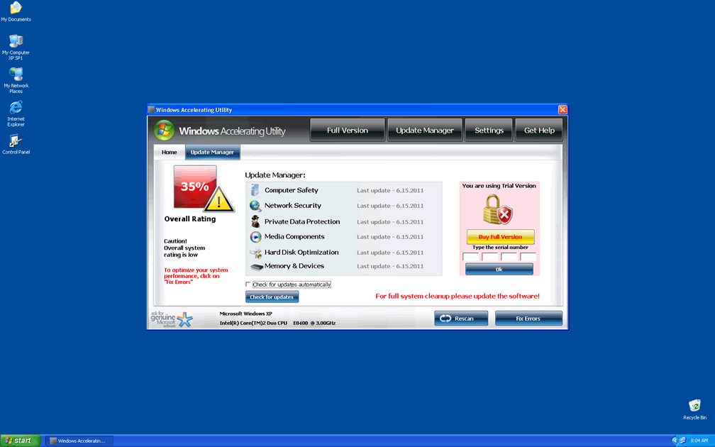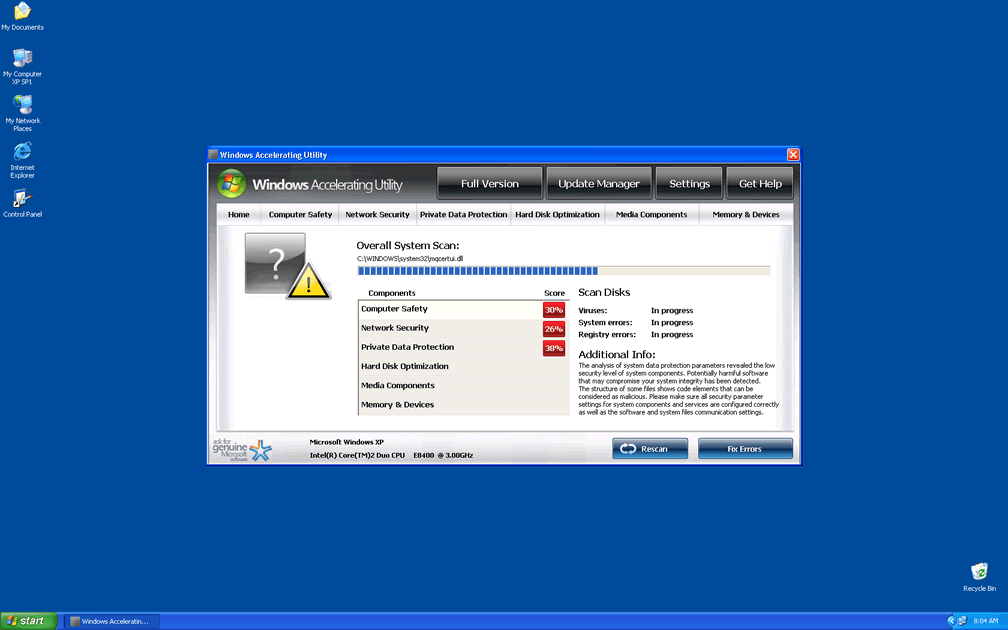 Windows Accelerating Utility is a rogue security application that creates fake security-related grades for your PC, along with false infection warnings to confuse you about the state of your PC security. While trying to make you think that your machine is under attack by a host of threats, Windows Accelerating Utility will request that you purchase Windows Accelerating Utility's full version, to remove these attackers. However, Windows Accelerating Utility has no genuine anti-virus features, and will itself cause issues like browser hijacks and crashing programs. The use of updated anti-virus software in Safe Mode should render removing Windows Accelerating Utility a trivial process.