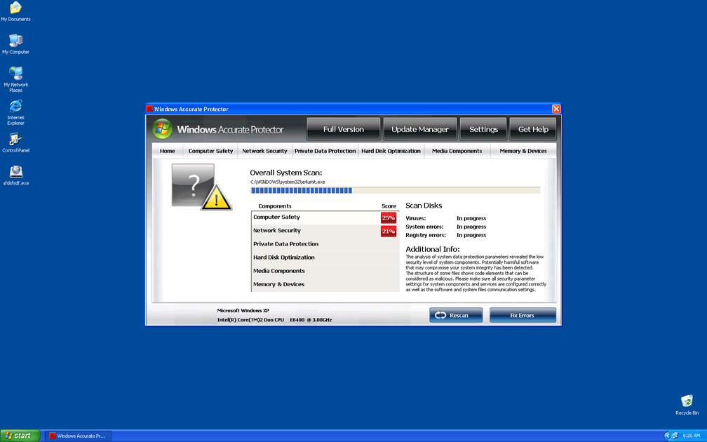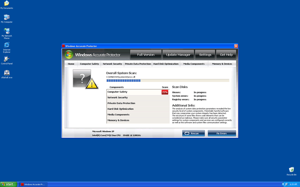 Malicious websites that are linked to Windows Accurate Protector don't want you to know that Windows Accurate Protector is really a copy of other fake computer optimization and hard disk defragmenter tools. Other members of Windows Accurate Protector's extremely large subgroup include Windows Vulnerabilities Rescuer, Windows Easy Supervisor, Windows Salvor Tool, Windows Debugging Agent and Windows Debugging Center.
