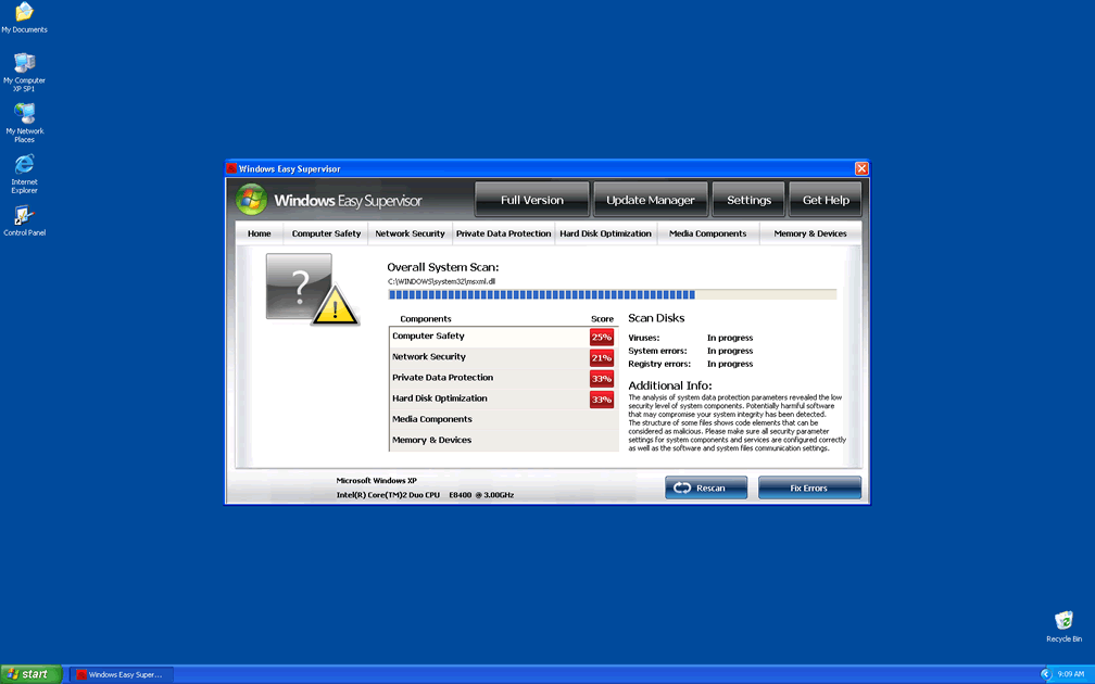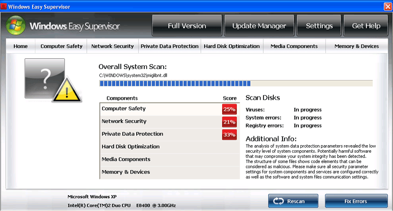 Windows Easy Supervisor infections are identical to those of Windows Easy Supervisor's clones, such as Windows Debugging Center, Windows Vulnerabilities Rescuer, Windows Antivirus System, Windows Inviolability System and Windows Necessary Firewall, to name a few recent examples. However, you still may need to update your anti-virus software to detect and remove Windows Easy Supervisor.