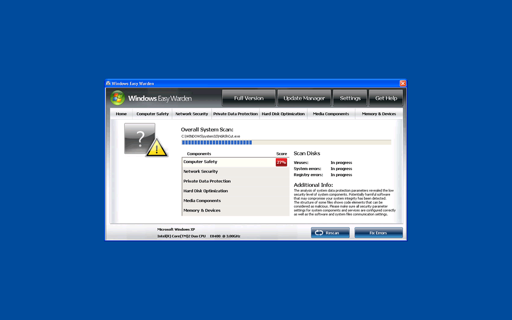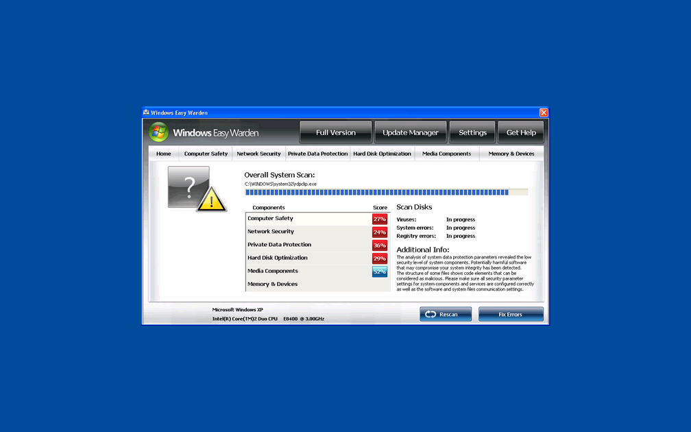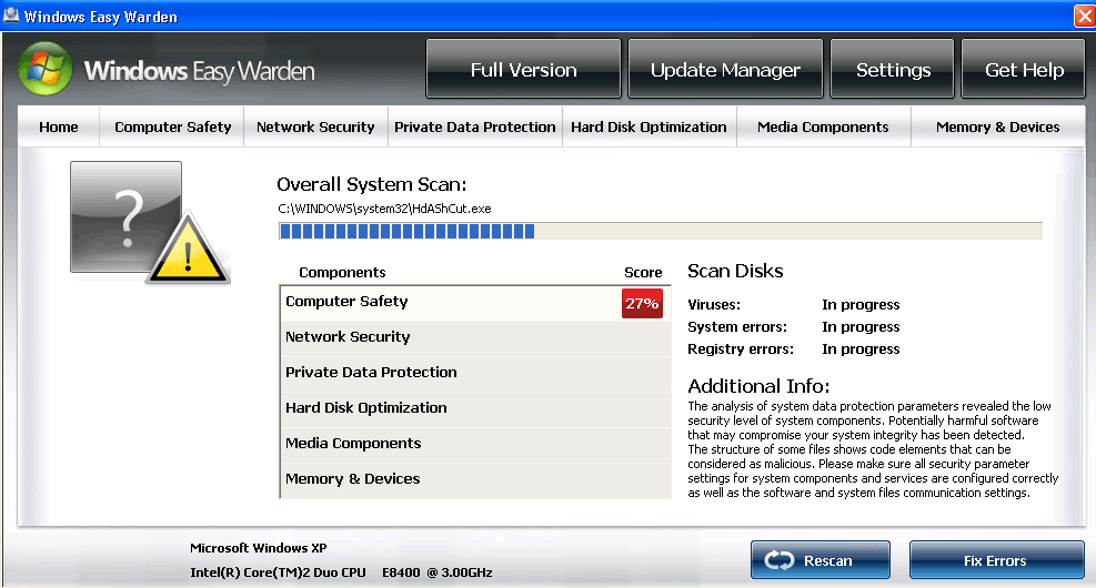 In spite of lacking real threat-combating features, Windows Easy Warden will fake system scans, percentile-based security monitoring and even pretend to find threats on your computer. Some of the standard messages that you may find Windows Easy Warden issuing include: