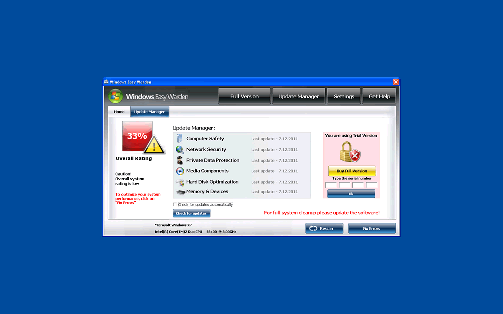 In most cases, the above Trojans will try to deceive you into thinking that Windows Easy Warden is a necessary security program that can remove some PC threat that was noted prior to the installation process. However, all threat detections from Windows Easy Warden and affiliated programs are fake, and Windows Easy Warden itself has no threat-removing functions.