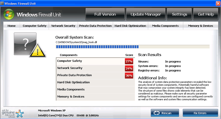 Some of Windows Firewall Unit's close relatives include Windows Tasks Optimizer, Windows Virtual Firewall, Windows Profile System, Windows Precautions Center, Windows Oversight Center and Windows Tweaking Utility. Despite the different names, these rogue security programs all attack your PC in similar ways.
