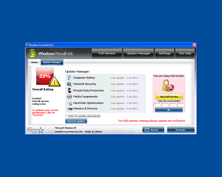 These warnings are dangerous in that they can convince you that threats like Rbot viruses exist when they're really not present at all. Not only can Windows Firewall Unit not do anything Windows Firewall Unit says it can do, but purchasing Windows Firewall Unit will endanger your credit card with the possibility of repetitive fraudulent charges.