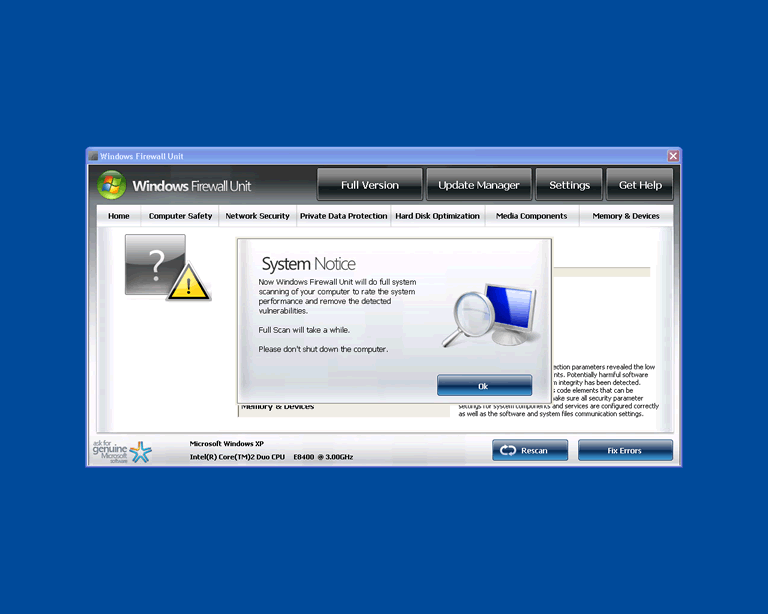 Along with creating a fake system analysis display, Windows Firewall Unit will create pop-up alerts like the following: