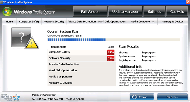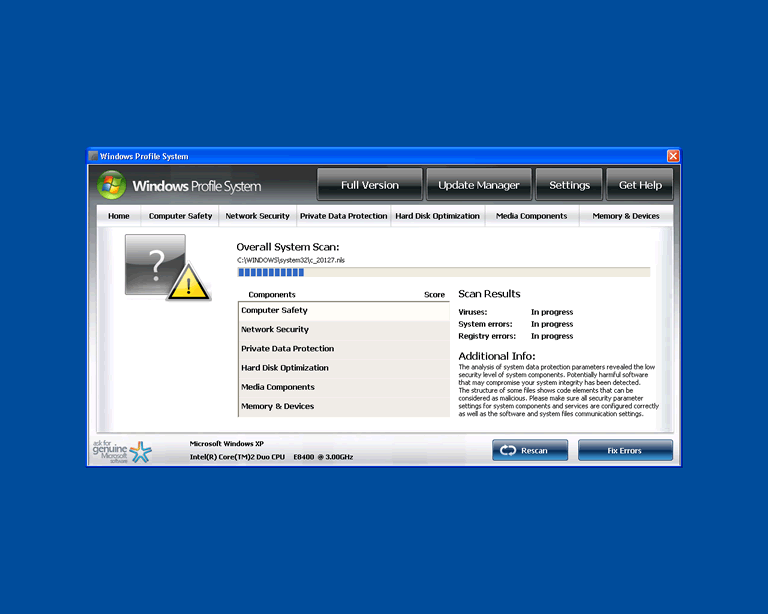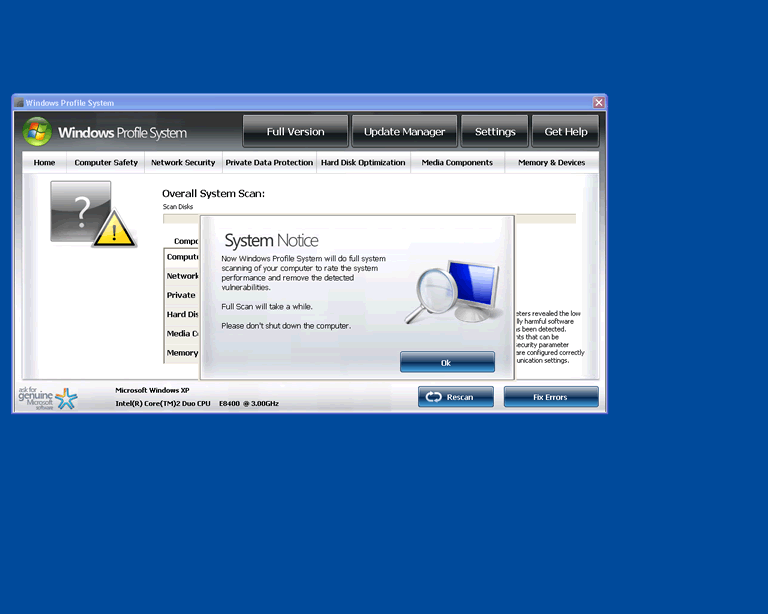 Windows Profile System will consistently rate your system as poor in most or all areas, but this isn't indicative of security problems on your PC – because Windows Profile System isn't analyzing your computer in the first place. You can also see various fake alerts by Windows Profile System and its clones that use similar false positive warning tactics:
