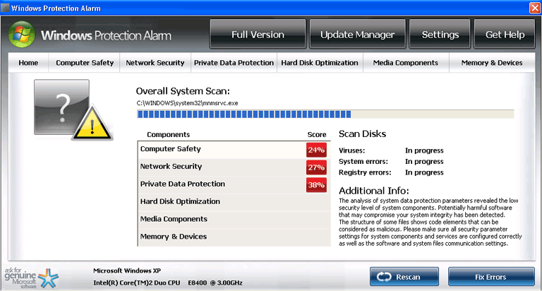 Windows Protection Alarm is a rogue anti-virus and security program that creates fake infection warnings and fake grades for your PC security. Windows Protection Alarm requests money for a registration process in exchange for fixing problems on your computer, but Windows Protection Alarm will actually cause problems like browser hijacks and program crashes instead of fixing them. You should remove Windows Protection Alarm by preventing Windows Protection Alarm from running and then using a suitably advanced anti-malware scanner.