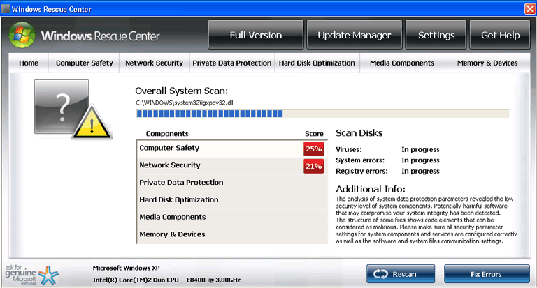 Some of Windows Rescue Center's errors may fake indications of particular programs being infected: