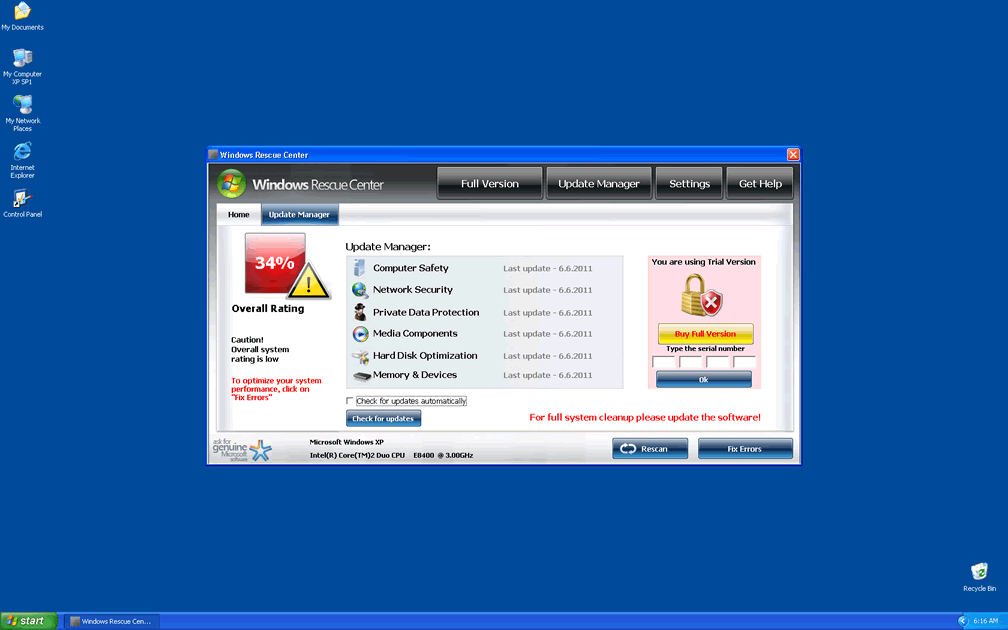 Windows Rescue Center errors and pop-up warnings are never accurate and should never be trusted. If you've purchased Windows Rescue Center prior to reading this, you should speak to your credit card company to have the fraudulent charges canceled.