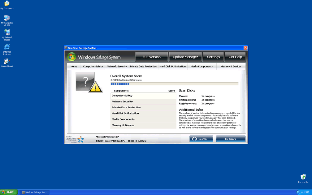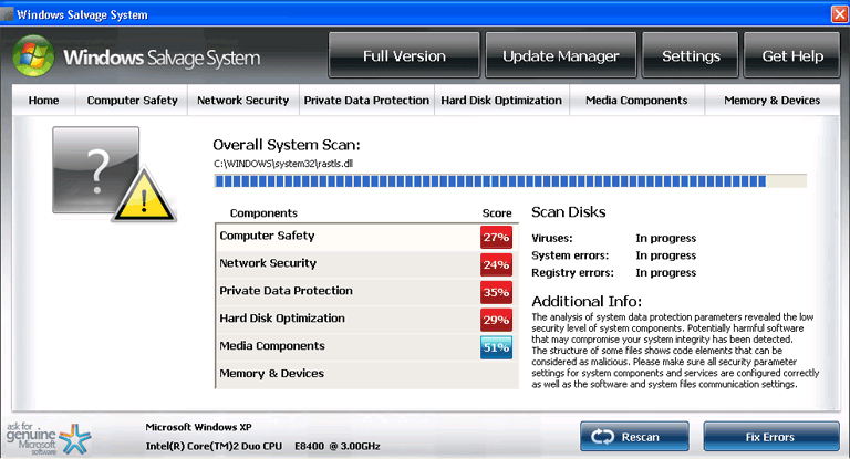 Like most rogue security programs, Windows Salvage System can't detect real threats to your PC. All of Windows Salvage System's errors and other information should be disregarded for being irrelevant, misleading and potentially self-destructive for your computer.