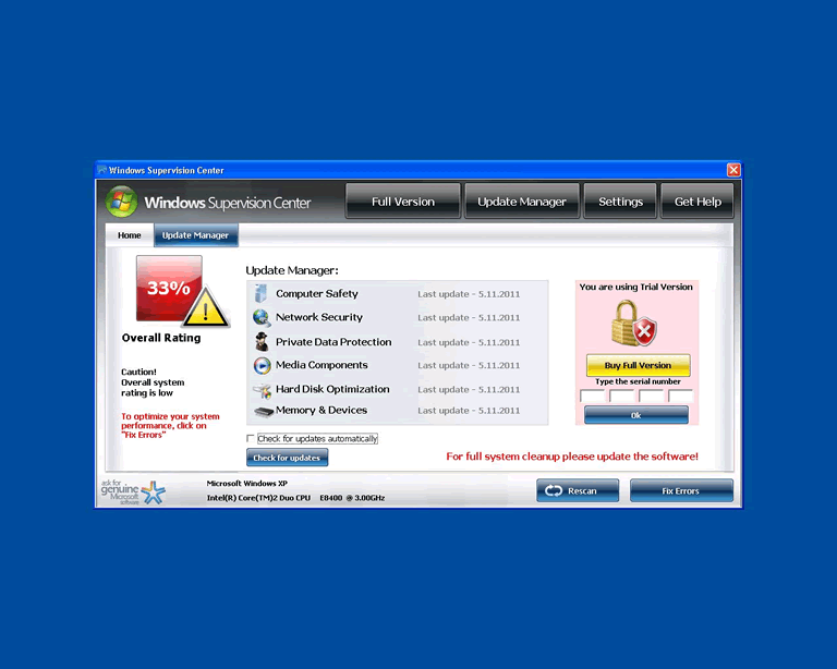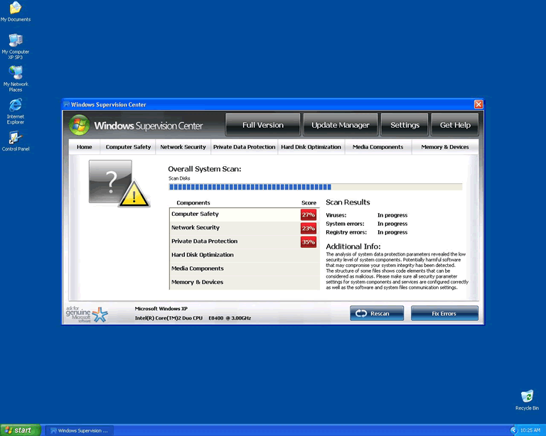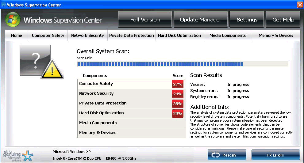 Windows Supervision Center is a re-skin of slightly older rogue security applications. Like its cousins, Windows Supervision Center can stop programs from running, take over your web browser or display fake alerts about infections that aren't on your PC. Although purchasing Windows Supervision Center may reduce its attacks, this puts your credit card number in jeopardy and isn't recommended. Instead, consider getting rid of Windows Supervision Center by using real anti-malware software.