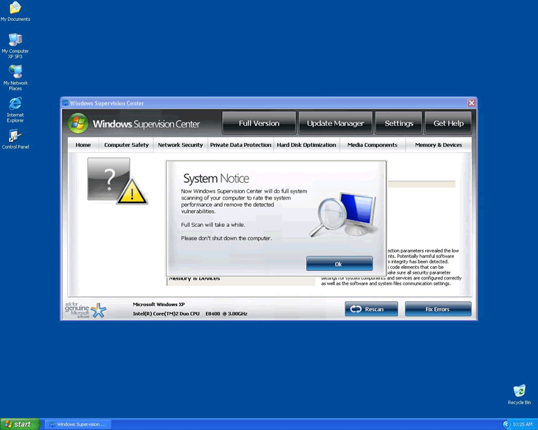 The most visible and irritating part of a Windows Supervision Center infection is its fake alerts and pop-ups, which use messages like the ones you can see below as part of a fake infection ruse: