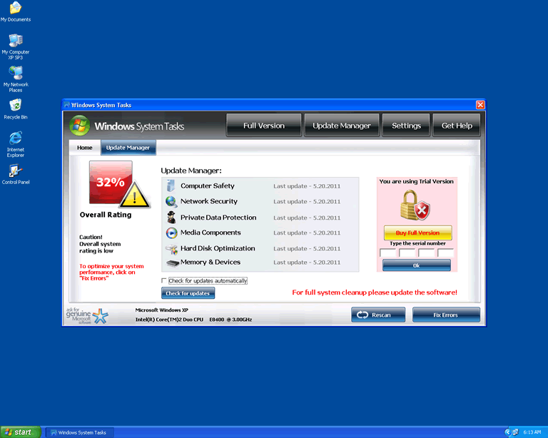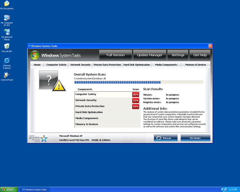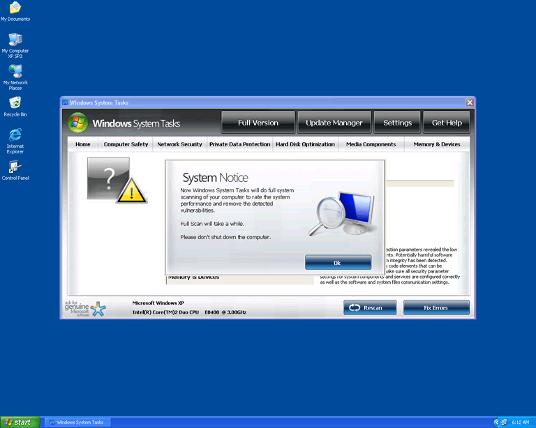 After installing Windows System Tasks or another rogue security program, the Trojan will force your PC to reboot. This lets Windows System Tasks launch itself automatically, since Windows System Tasks has Registry entries that slip Windows System Tasks neatly into your default Windows startup routine.