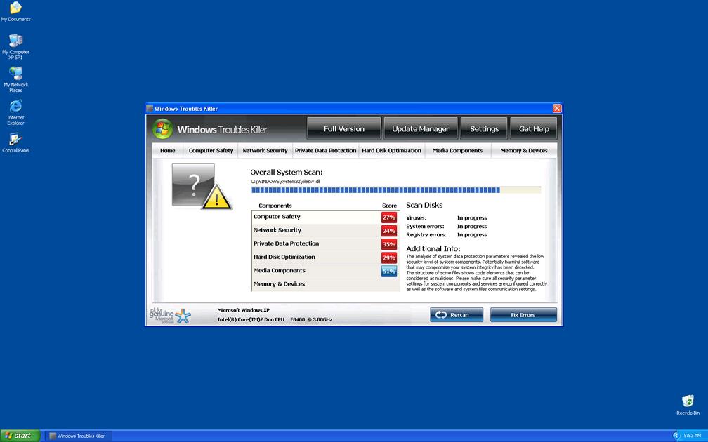 Windows Troubles Killer also uses an interface that pretends to give your PC poor grades on different aspects of security, and may fake system scans. Like the errors that can only detect infections that aren't really there, these Windows Troubles Killer features are fake, and should be ignored.