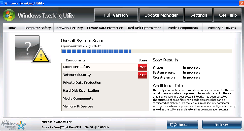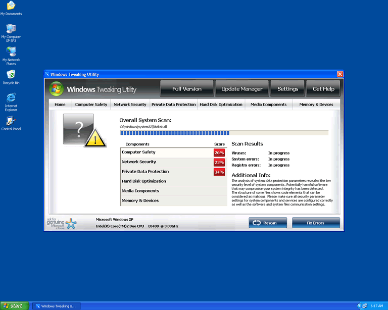 Windows Tweaking Utility is a rogue security program that offers fake system optimization and protection features in exchange for your money. While on your PC, Windows Tweaking Utility will enhance the appearance that you need it by blocking the usage of various applications, creating inaccurate threat alerts and hijacking your web browser. Windows Tweaking Utility is also likely to be accompanied by a Trojan, and for this reason, it's suggested you avoid trying to remove Windows Tweaking Utility without the help of a well-designed anti-malware application.