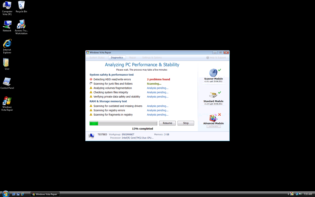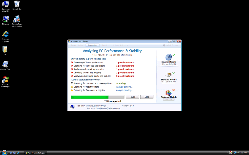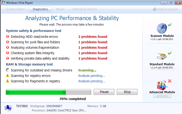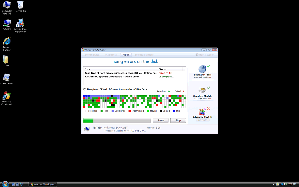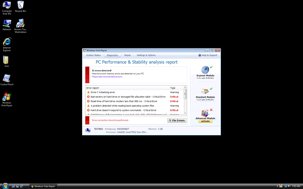 Windows Vista Repair pretends to be a defragger to get onto your computer in the first place, and may be installed accidentally or by a Trojan. Unlike a real defragger, Windows Vista Repair will pretend to offer many vaguely-related functions that involve checking for a variety of errors on your computer. These features will trigger alerts and warnings every time you try to defrag your PC with Windows Vista Repair.