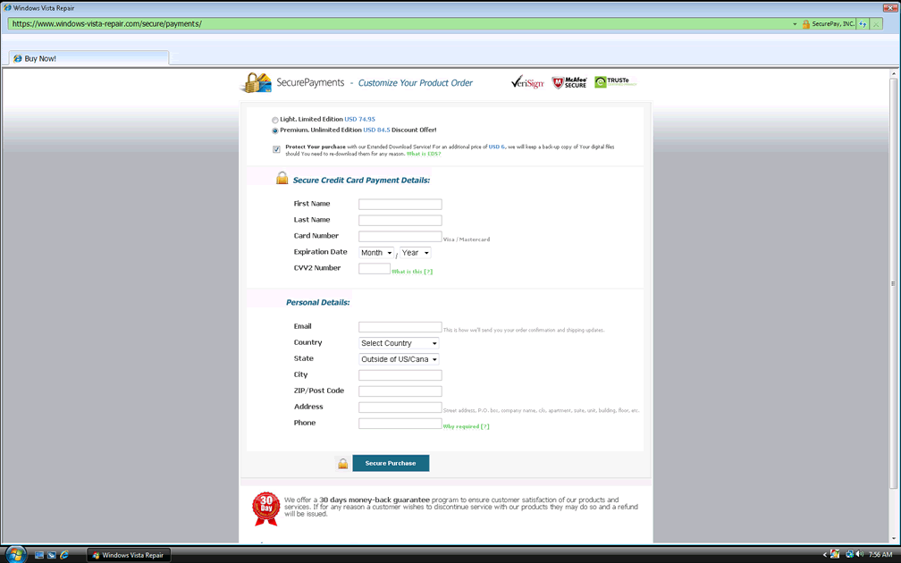 Threats that are identical to Windows Vista Repair are also being distributed with slight name variations like Windows XP Repair, Windows Vista Restore, Windows XP Restore and Windows 7 Restore. You can fake a registration process with any of these rogue security programs, including Windows Vista Repair, by using the code '8475082234984902023718742058948.'