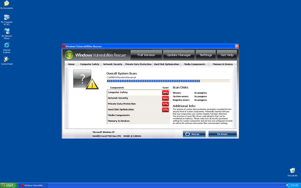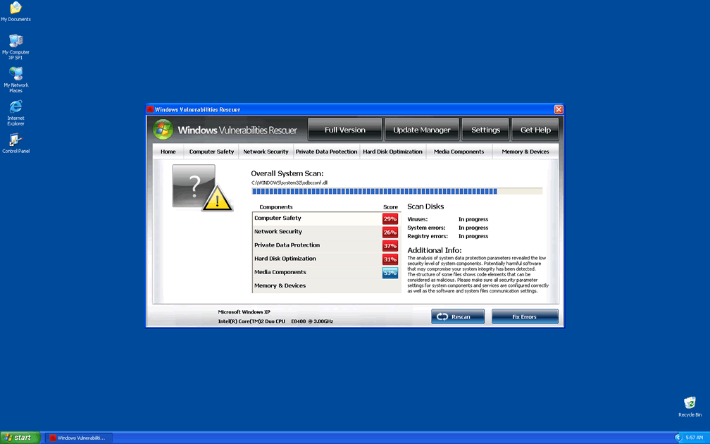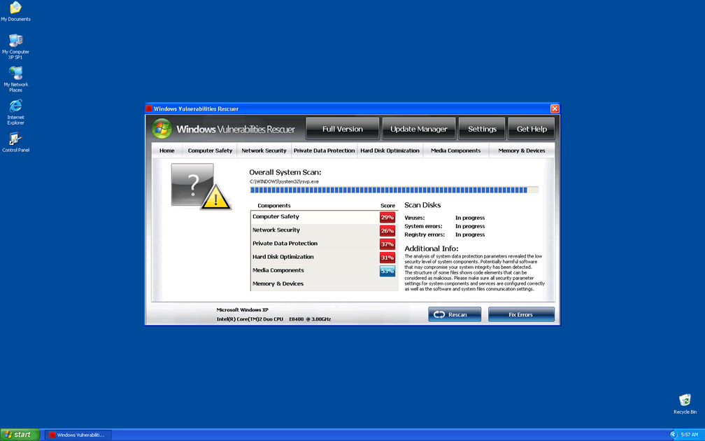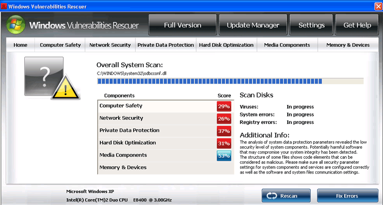 The basic interface for Windows Vulnerabilities Rescuer pretends to monitor multiple types of PC security, including network security, hard disk optimization, private data protection and media components. The only results of Windows Vulnerabilities Rescuer's monitoring are prefabricated scores that are designed to make it look like your PC is extremely insecure or damaged.