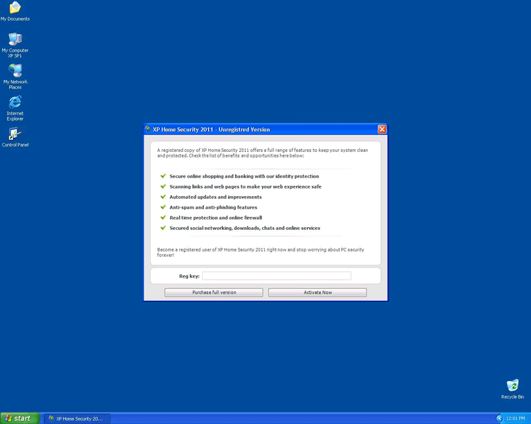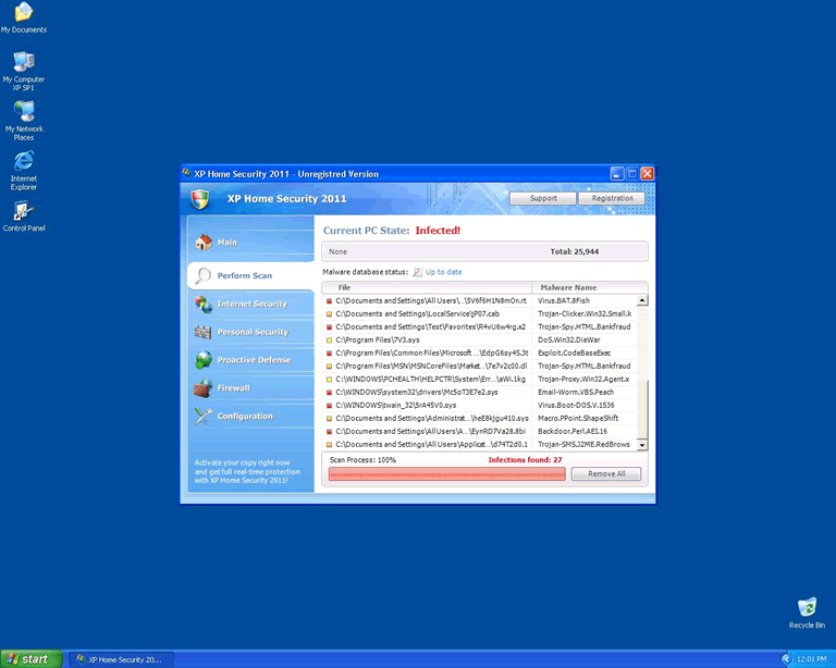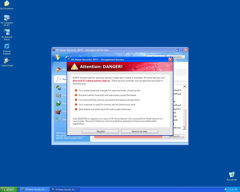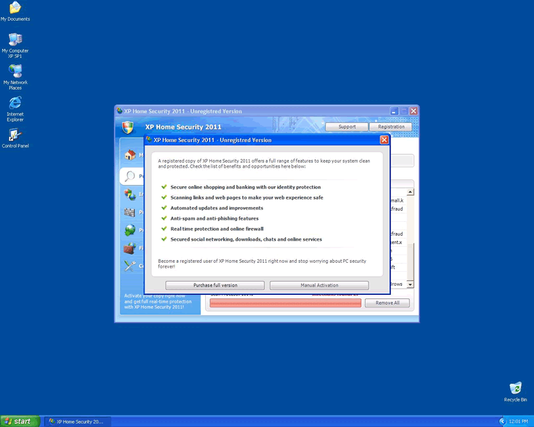 - XP Home Security 2011 can disable programs under its own power, usually announcing it with the excuse of another fake infection alert: