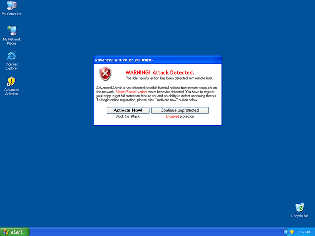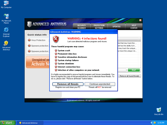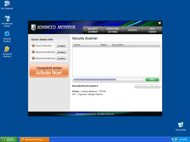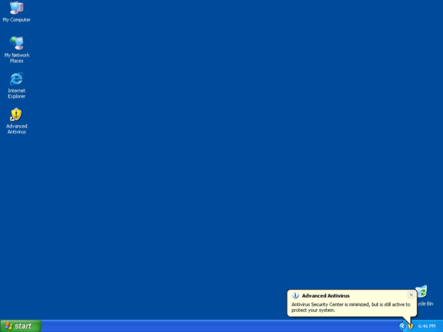 Advanced Antivirus, also known as AdvancedAntivirus, is a rogue anti-virus program that displays a fake icon on your system tray stating that your computer is infected with spyware. Advanced Antivirus will use fake security messages to urge you to download their software and will prompt you into purchasing the full version of Advanced Antivirus. Advanced Antivirus is part of the same family of rogue anti-spyware programs as Windows Antivirus 2008, Vista Antivirus 2008 and Ultimate Antivirus 2008.