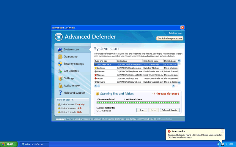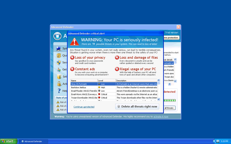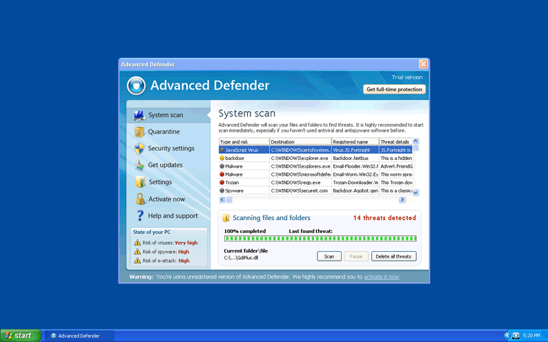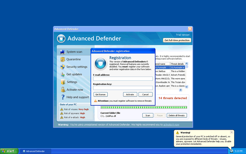 Advanced Defender is a rogue anti-spyware program that produces a fake scan to alert potential victims of security risks on their PCs. Advanced Defender uses trojans to gain entry into the computer. Sometimes executing prompts from malicious websites may also lead to the installation of Advanced Defender. This unwanted program will exhibit a number of alerts that redirect the Internet browser to a website which recommends a purchase of Advanced Defender to remove viruses. This is a deliberate scam, so do not fall for the trickery and have Advanced Defender terminated with a proven malware remover immediately.