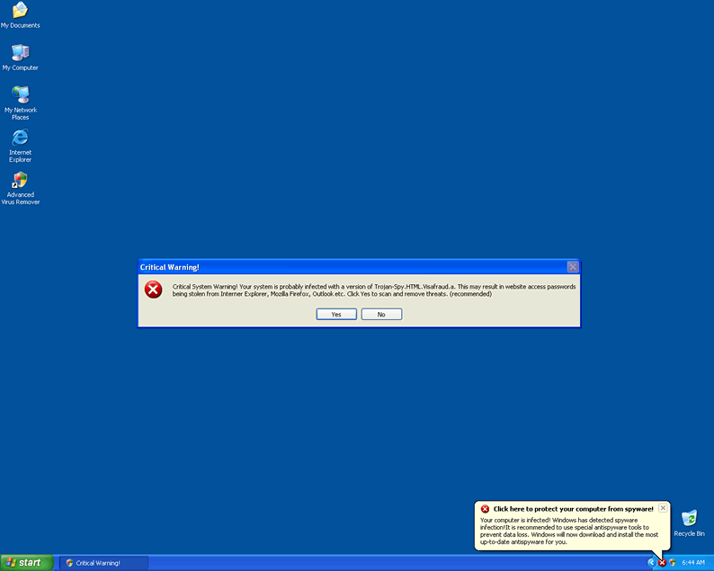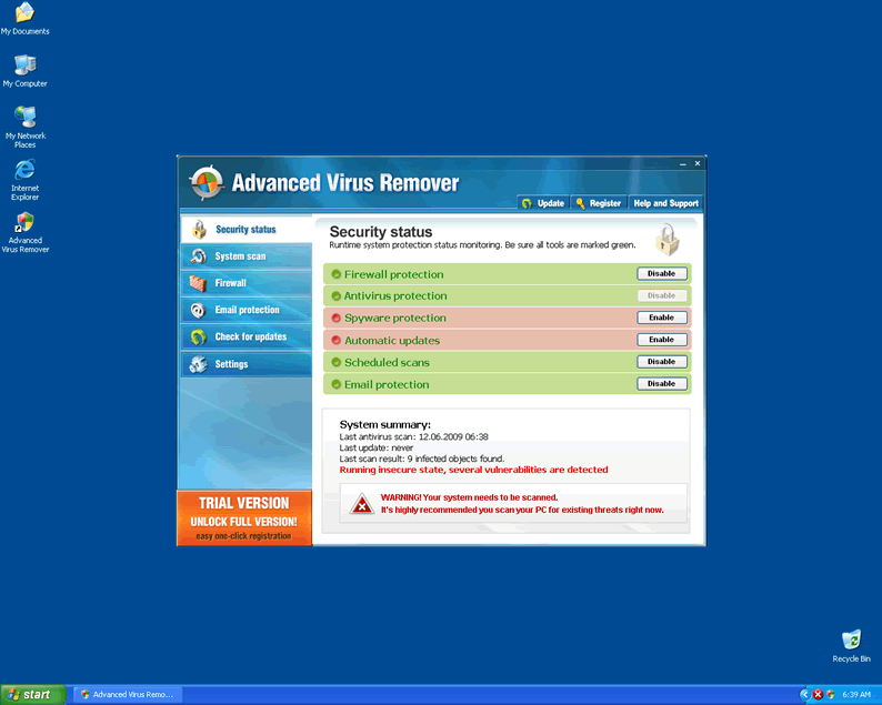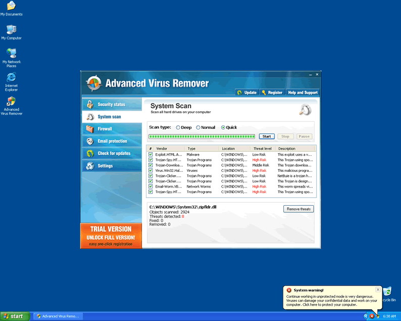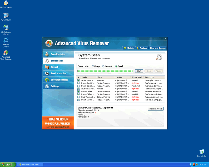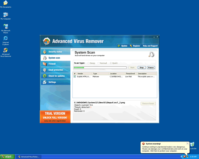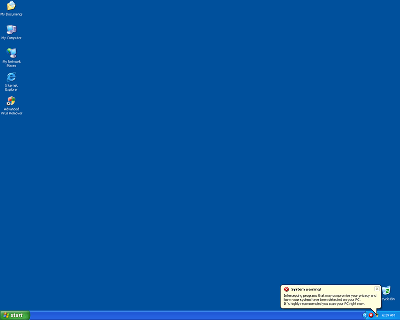 Advanced Virus Remover (also known as AdvancedVirusRemover) is a malicious program whose main goal is to trick people into purchasing its licensed version. Using affiliated trojans to infiltrate a computer without your knowledge or permission, and when installed and active, Advanced Virus Remover displays annoying popup system warnings and system tray alerts reporting viruses that can allegedly damage your confidential data and deteriorate the system performance. Advanced Virus Remover also runs fabricated security scanners that return scan results full of spyware applications, trojans, worms and other malware. All the above alerts and scans attempt to mislead you into thinking you have serious PC risks and need to handle them using Advanced Virus Remover commercial version. Thus, it is suggested you purchase and install the licensed version of Advanced Virus Remover.