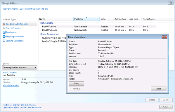 HKEY..\..\..\..{RegistryKeys}SOFTWARE\Classes\BlockUTubeAd.BlockUTubeAdSOFTWARE\Microsoft\Windows\CurrentVersion\Policies\Ext\CLSID\{19AE4FFA-B870-650E-37C2-466413BF6450}