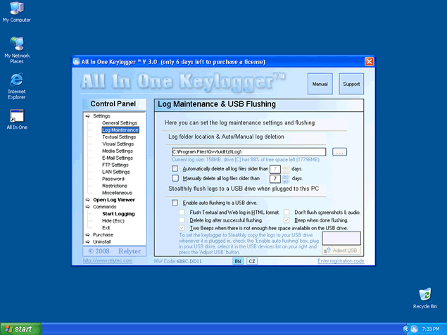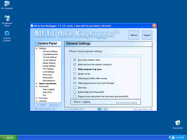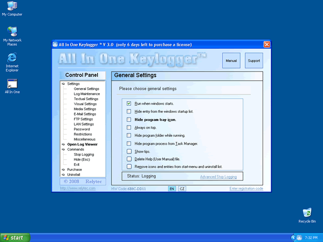 All In One Keylogger is a spyware keylogger application. This application records every keystroke that you type on your computer, and hides itself from the user by running in stealth mode. It can be configured to log every web page that you visit and will also record all keystrokes that you type, as well as any instant messenger and email conversations. It can also be configured to take screenshots at a preset interval. This program is a severe violation of your privacy and the safety of your personal and financial data, including banking information and credit card numbers.