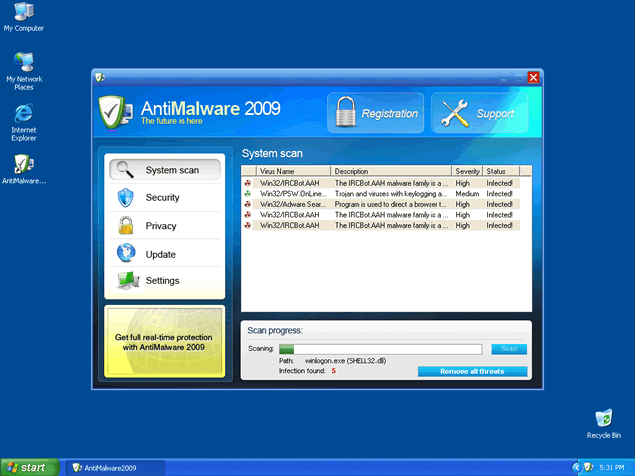 AntiMalware 2009, also known as AntiMalware2009, is a rogue anti-spyware program and a clone of eAntivirusPro and XP Protector 2009. AntiMalware 2009 may have installed on your computer system with the help of Trojan Zlob or other malicious methods. You may have also downloaded AntiMalware 2009 from a rogue website thinking it would remove your spyware threats. Once AntiMalware 2009's trial version is installed, it will run a fake system scan to generate a list of spyware results that are supposedly found in your system. Along with this scan, popups and fake system alert messages may appear to "inform" you about your supposed infections.