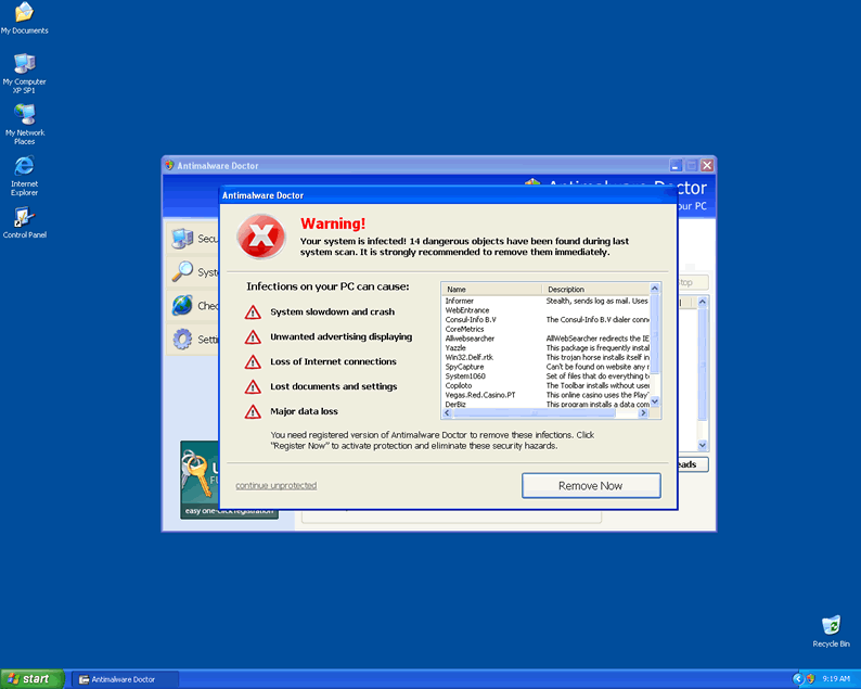 | 4 | Warning! Removed attack detected! Antimalware Doctor has detected that somebody is trying to block your computer remotely via Trojan.win32.Agent.azsy. Transfer for your private data via internet will start in 10. |
