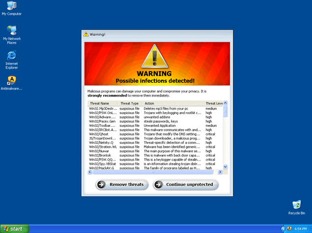 AntiMalware PRO's trial version is also able to run a fake computer system scan and display a list of security risks supposedly found in your computer system. These risks will not be removed unless you first buy AntiMalware PRO's "licensed" program.